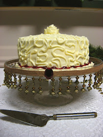 For our dessert, mom got this beautiful raspberry filled white cake at Publix which we put on a cake stand decorated with trim and a "jewel" worthy of the theme.